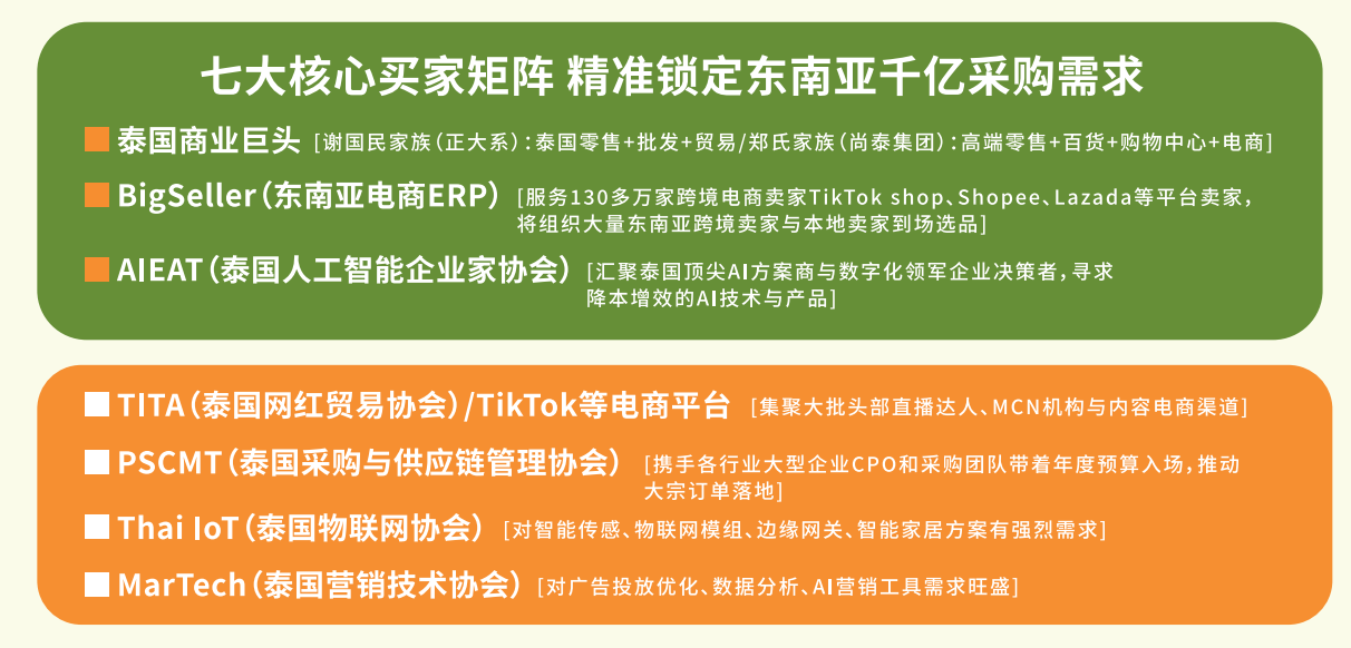 商协会机构及实体专业买家团:组委会新加坡与泰国团队通过与东盟各国政 府部门、商协会及行业专家的接触,全面掌握东南亚投资环境,洞悉当地市 场需求,精准匹配企业投资和贸洽资源,降低企业出海盲点,提高出海成效。